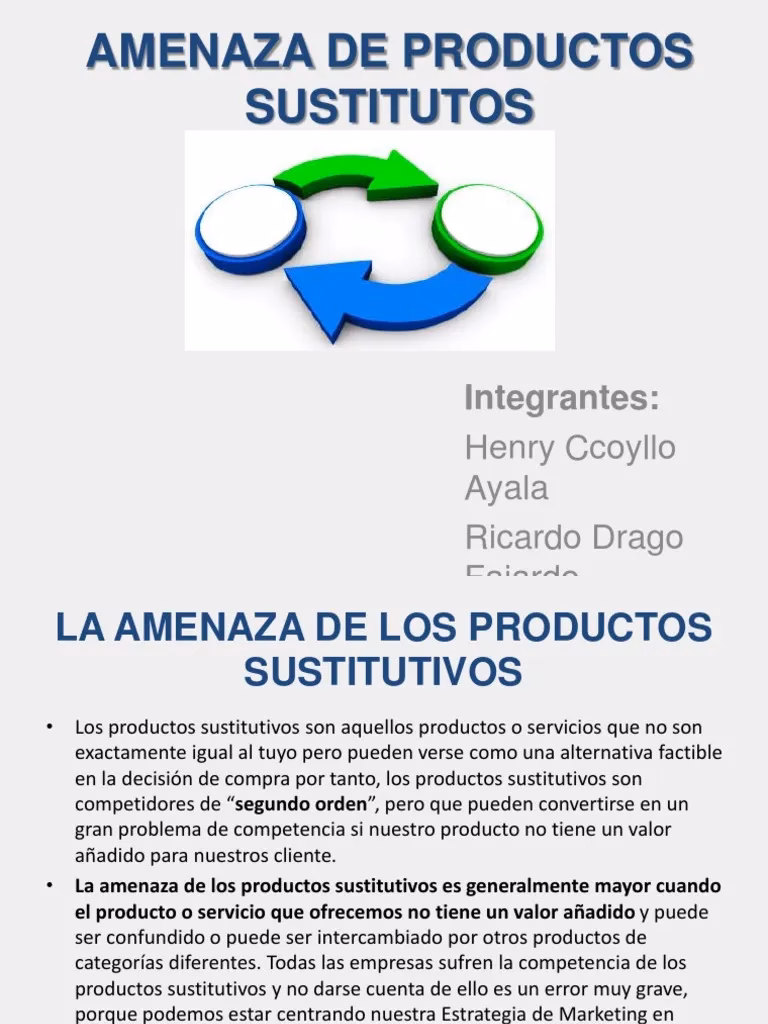 | Naturaleza de la Amenaza | Compiten por el mismo cliente con productos muy similares o idénticos. | Cumplen la misma función o necesidad, pero son fundamentalmente diferentes en forma y tecnología. |