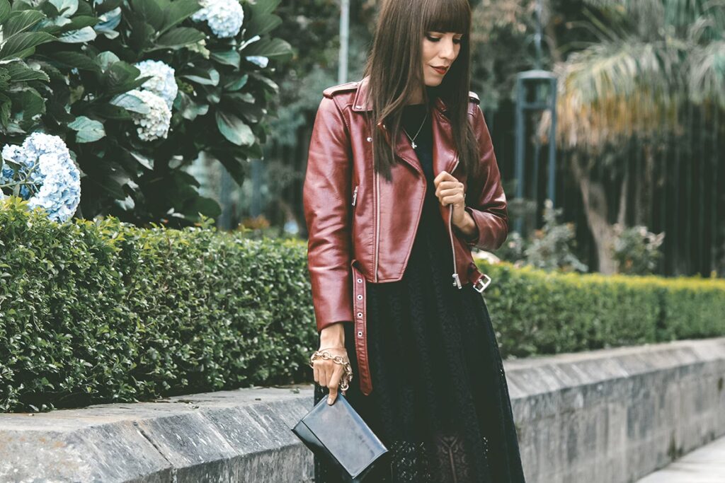 - Faldas Estampadas: Con florales, lunares o animal print, la casaca de cuero (preferiblemente negra o marrón neutra) debe armonizar con uno de los colores del estampado. Esto unifica el conjunto y le da coherencia.