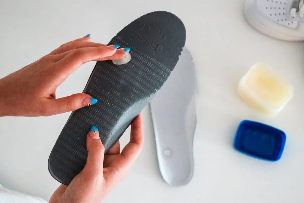Si la fricción se produce entre la suela y la plantilla, o entre la suela y el cuerpo del zapato, puedes aplicar un lubricante para reducir el roce. Opciones comunes incluyen lubricante de silicona en aerosol (aplicado con precaución para no manchar), cera para calzado (especialmente en los bordes donde se unen las partes) o incluso jabón de barra seco. Aplica una pequeña cantidad de lubricante en las zonas de fricción y frota suavemente. Asegúrate de que el lubricante se absorba por completo y que no deje residuos resbaladizos antes de usar los zapatos.