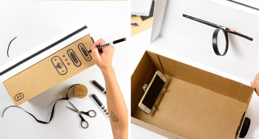 • Opcional: un soporte o base para el teléfono dentro de la caja (puede ser otro trozo de cartón, un libro pequeño, etc.).