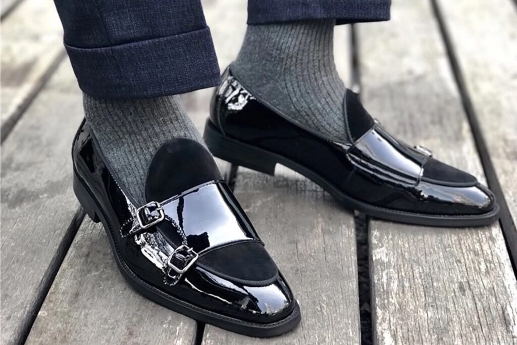 Si bien la experimentación es bienvenida, hay ciertas combinaciones que es mejor evitar para preservar la elegancia del charol. Una de mis principales recomendaciones es no elegir modelos con elementos metálicos prominentes, como las hebillas laterales que caracterizan a los zapatos tipo monkstrap. Si bien los monkstraps son un zapato elegante por derecho propio, la adición de hebillas en un modelo de charol puede restarle protagonismo al brillo natural del zapato. Además, rompe con esa pureza clásica que es precisamente la razón por la que lo combinamos con un look casual: el contraste entre la simplicidad del atuendo y la sofisticación intrínseca del charol. Queremos que el charol sea el punto focal, no que compita con otros adornos.