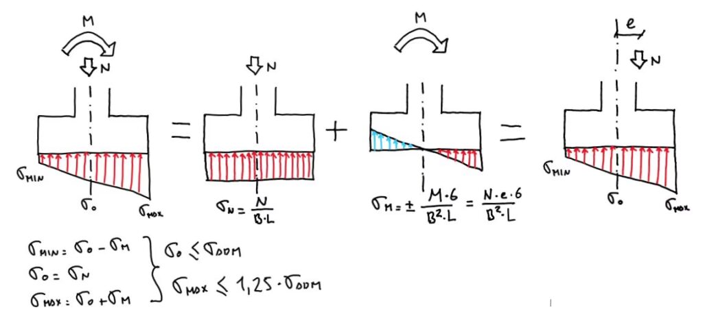 La distribución de tensiones bajo una zapata de dimensiones en planta `a·b` se describe clásicamente por la fórmula de Navier para secciones sometidas a flexión compuesta. Esta fórmula es fundamental para entender cómo se distribuyen las presiones en la base de la cimentación: