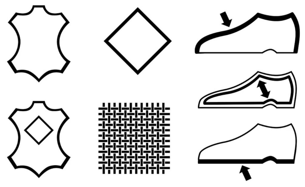 Existen símbolos universales: una piel extendida para cuero, la misma piel con un rombo para cuero untado, fibras entrelazadas para textil, y un rombo solo para otros materiales. Estos indican el material predominante en cada parte del zapato.
