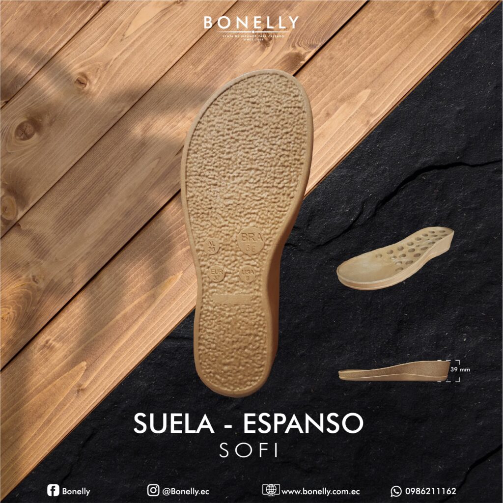 Las suelas espanso están hechas de PVC Expanso (PVC Expandido). El proceso de expansión reduce su densidad, lo que las hace significativamente más ligeras que las suelas de PVC sólido. A pesar de su ligereza, mantienen la característica "plástica" del PVC, lo que normalmente les confiere buenas propiedades antideslizantes. Son una excelente opción para calzado que busca maximizar la ligereza sin comprometer demasiado la resistencia al deslizamiento, ideales para zapatos casuales y sandalias donde el peso es un factor crítico.