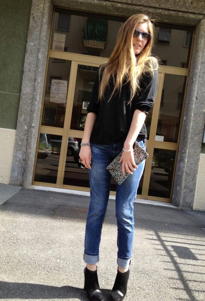 - Outfit con Blazer y Tacones: La combinación de pantalones vaqueros con camiseta negra es un clásico que nunca pasa de moda. Para elevarlo, añade unos tacones delicados y un blazer en el mismo color que los vaquero o en un tono complementario como el gris o el azul marino. Si te atreves, un blazer con un estampado llamativo puede añadir personalidad. Para los pies, unos tacones de aguja negros son la opción obvia, pero unos botines de cuero marrón oscuro pueden introducir un elemento de calidez y tendencia.