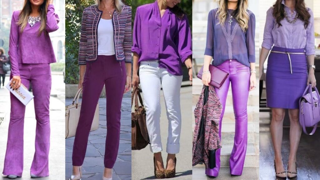 - Amarillo y Naranja: Estos colores complementarios al morado crean un contraste llamativo y alegre. Un top amarillo mostaza o un naranja quemado con un pantalón morado puede resultar en un outfit muy original y lleno de personalidad, ideal para la primavera.