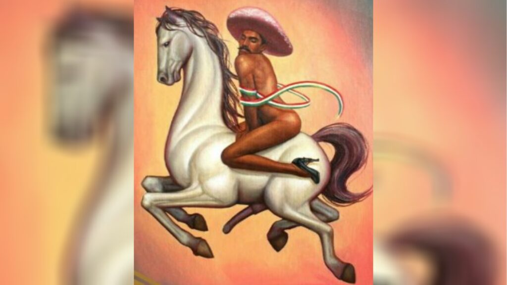 Sin duda alguna, la obra de arte más polémica que retrata al Caudillo fue la creada por Fabián Cháirez. Su pintura audaz y provocadora representó a Zapata desnudo, montando a caballo con una pose sensual, rasgos que algunos interpretaron como femeninos, usando un sombrero rosa y, lo más notable, ¡zapatos de tacón! Esta obra formó parte de la exposición "Emiliano. Zapata después de Zapata" en el Museo del Palacio de Bellas Artes, que conmemoraba el centenario del fallecimiento del líder revolucionario.