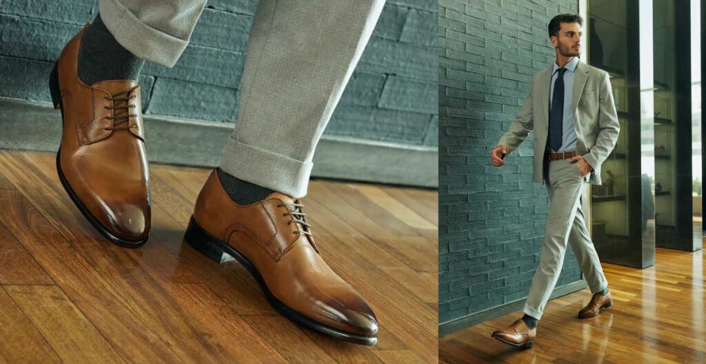 A diferencia del Oxford, el Derby presenta un sistema de cordones abierto, donde las solapas están cosidas por encima del empeine. Esta construcción le otorga una apariencia ligeramente menos formal pero mucho más versátil. Es perfecto para trajes de negocios, pantalones de vestir e incluso para un atuendo más elegante de «smart casual». Los Derby pueden encontrarse en una amplia gama de materiales, desde cuero liso hasta gamuza, y en diversos colores, lo que los convierte en una opción excelente para eventos de día o situaciones donde se busca un equilibrio entre formalidad y comodidad.
