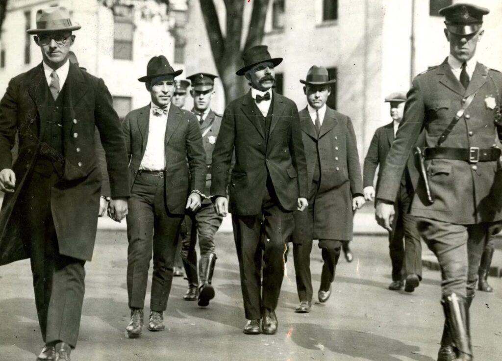 Fue en este caldo de cultivo donde Nicola Sacco, un zapatero, y Bartolomeo Vanzetti, un pescador, ambos inmigrantes italianos y reconocidos (aunque reticentes a admitirlo públicamente al principio) anarquistas, cayeron en la mira de las autoridades. Su detención, el hecho de ir armados y sus mentiras iniciales durante los interrogatorios, que se enfocaron más en su filiación política que en los crímenes en sí, sellaron su destino en una sociedad ávida de chivos expiatorios. El juez Webster Thayer, conocido por su conservadurismo y su animadversión hacia los radicales, no tardó en entrar en escena, ansioso por “dar una lección a los extremistas”.