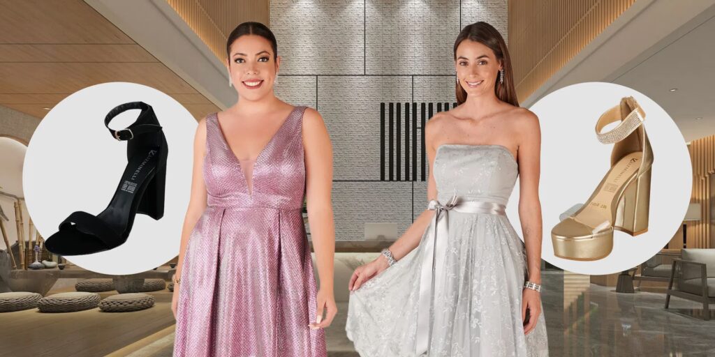- Bolsos y Calzado Infalibles: Los bolsos de fiesta pequeños, como los clutches o carteras de mano, son la opción más elegante y práctica. Combínalos con tacones altos y finos que no solo estilicen tu figura, sino que también complementen la formalidad del vestido.