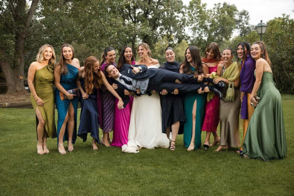 Evita el blanco, el marfil y los tonos demasiado claros que puedan confundirse con el atuendo de la novia. Opta por colores neutros como negro, azul marino, gris, marrón, o tonos pastel y metálicos que complementen tu vestuario. En cuanto a los materiales, el cuero, el ante, el satén o los acabados metálicos son excelentes opciones.