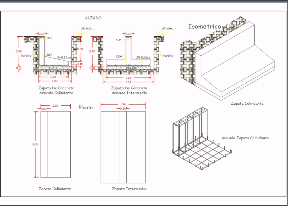 En el plano de concreto armado para zapatas centrales, se especifican sus dimensiones en planta (largo y ancho), su peralte (profundidad), el diámetro y espaciamiento de las barras de acero en ambas direcciones (parrilla inferior y, si aplica, superior), y el recubrimiento de concreto. La simplicidad de su diseño las hace muy comunes en la mayoría de los proyectos de construcción.
