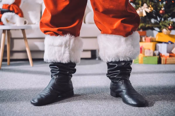 Las botas son un elemento práctico y estético. Tradicionalmente, son de color negro, altas (a menudo hasta la rodilla) y robustas, diseñadas para soportar los viajes por todo el mundo y las bajas temperaturas del Polo Norte. Al igual que el abrigo, muchas versiones incluyen puños de piel sintética blanca en la parte superior de las botas, conectando visualmente con el resto del atuendo. Los guantes, generalmente blancos, no solo mantienen las manos de Santa abrigadas, sino que también añaden un toque de pulcritud y formalidad a su apariencia.