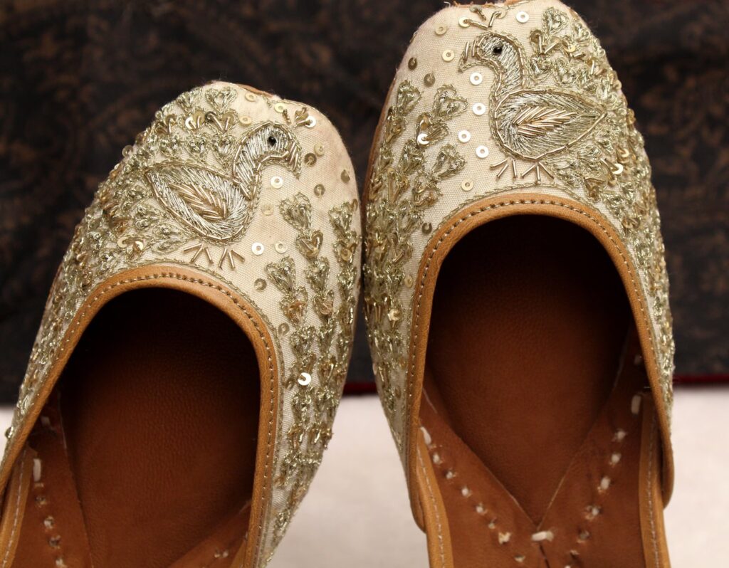 • Calzado: Los juttis y mojaris, zapatos de cuero bordados, son el calzado tradicional por excelencia. Suelen ser planos y ricamente decorados. También son populares las sandalias con pedrería o las kolhapuris, sandalias de cuero trenzado.