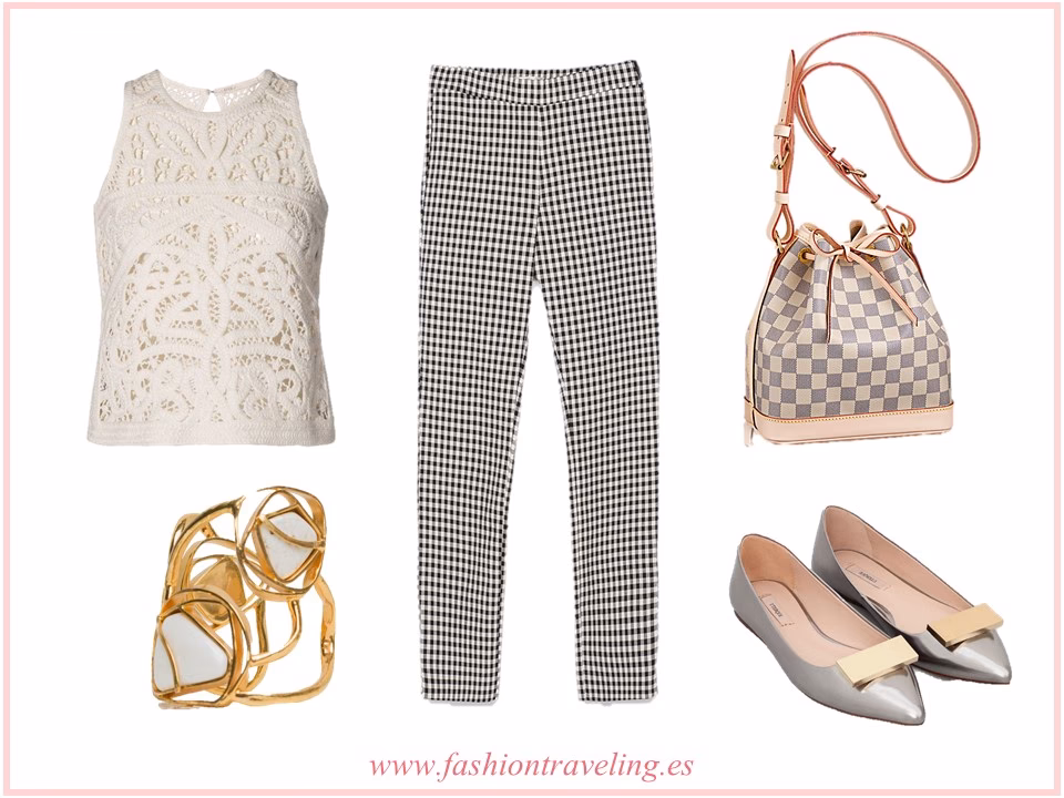 - Combina tus pantalones a cuadros de cintura alta o corte slim (preferiblemente en tonos neutros como los cuadros negros) con una blusa de seda o una camisa impecable.