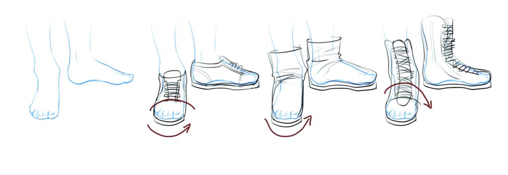 Una vez que te sientas cómodo dibujando el pie desnudo, es hora de vestirlo. Dibujar zapatos no es solo dibujar un objeto; es dibujar cómo ese objeto interactúa con el pie que contiene. La forma del zapato se adapta a la forma del pie, y esto es fundamental para el realismo.