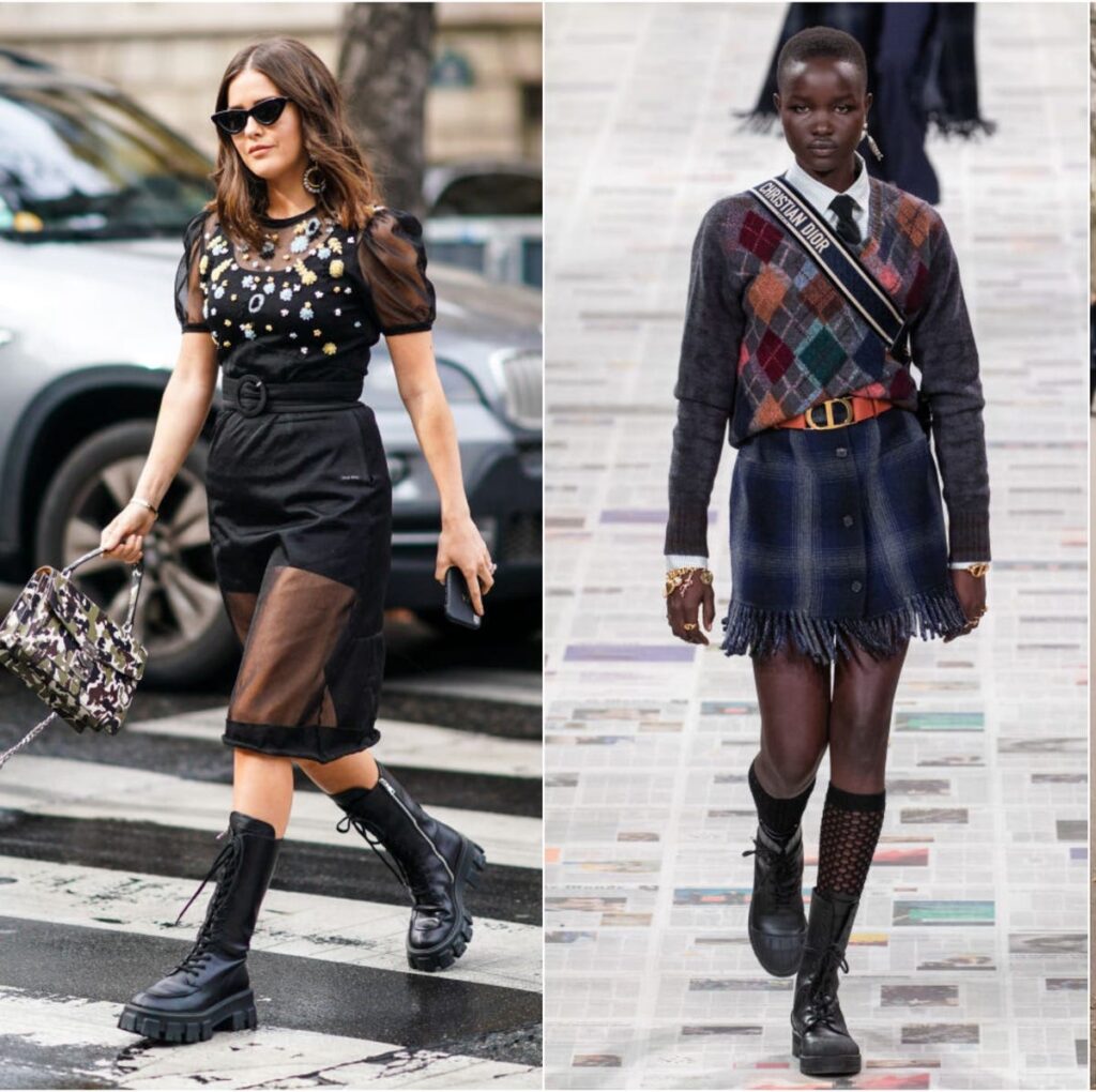 - Minifaldas de Cuero o Tweed: Para un enfoque más audaz y juvenil, las minifaldas de cuero o tweed se fusionan a la perfección con las botas militares. Opta por medias tupidas si el clima lo requiere y completa con una sudadera oversize o un blazer estructurado para un equilibrio de volúmenes.